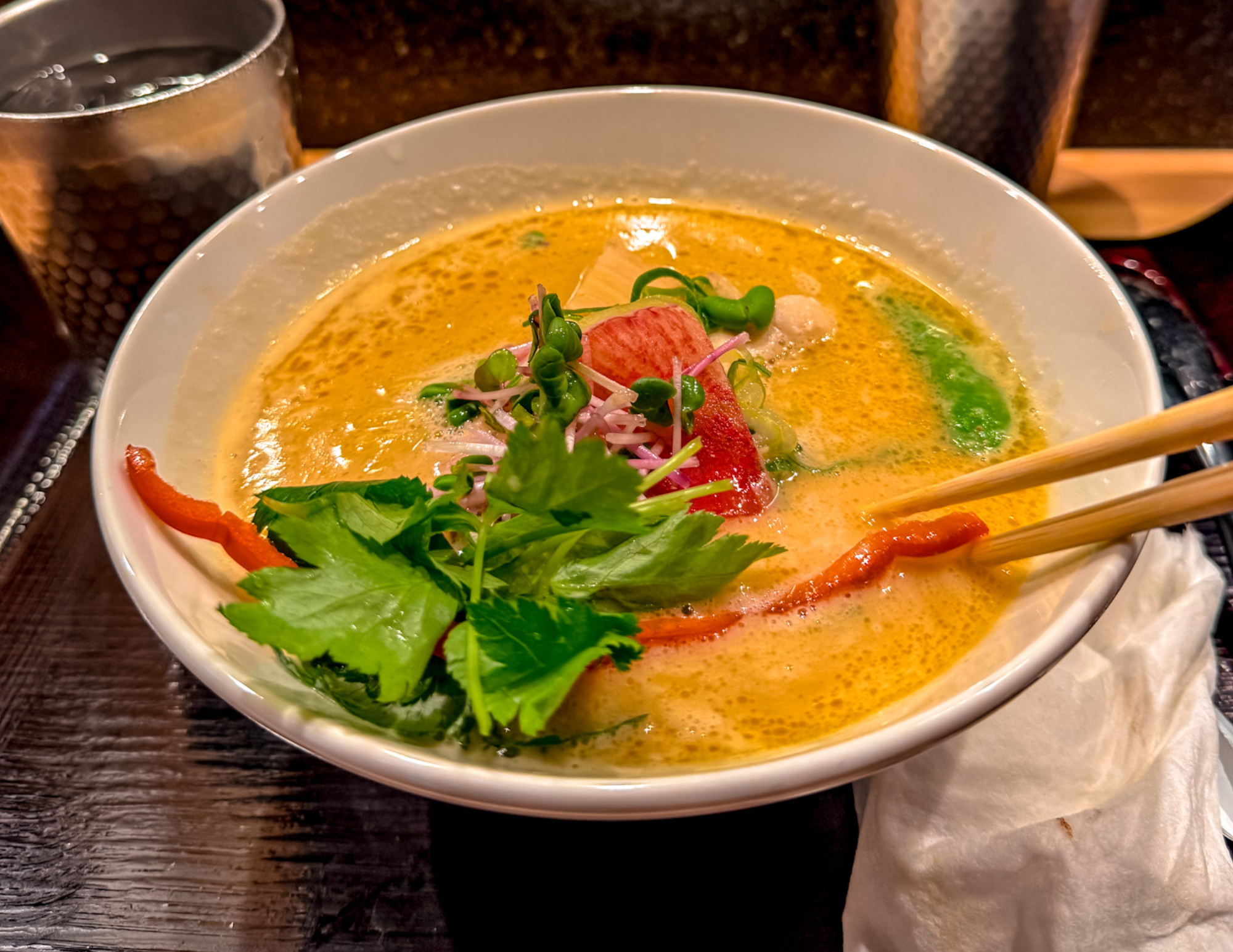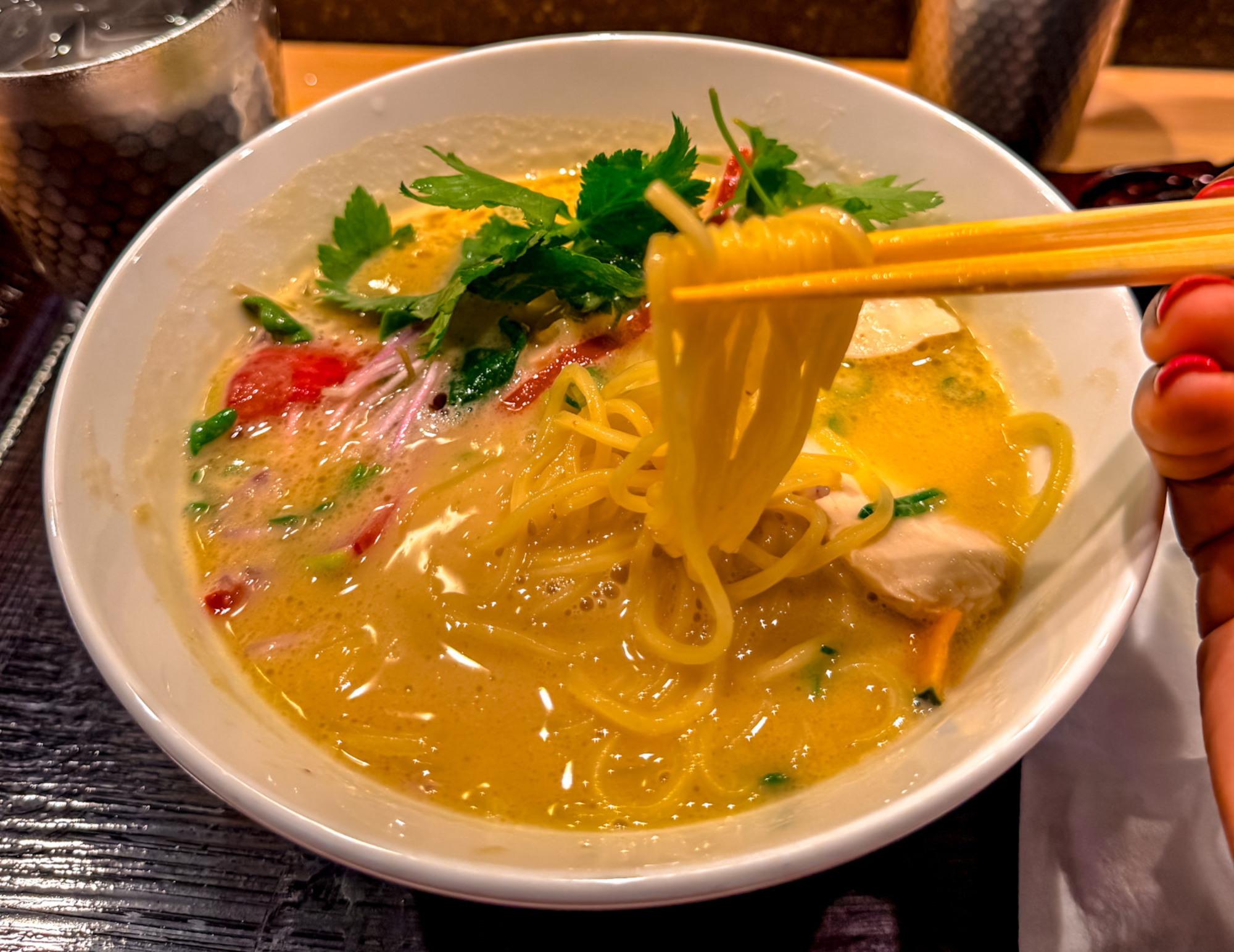 The soy sauce version was cleaner but still deeply satisfying. The broth had a strong umami base with a salty depth balanced by the slow-cooked chicken. Both bowls came with tender slices of chicken and soba noodles that held up perfectly in the broth without turning soft or soggy.